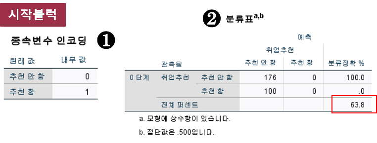 ❸ 0단계는 로지스틱 회귀분석의 첫 단계 모형을 의미하고, 이 단계는 독립변수 없이 상수항으로만 구성됨
