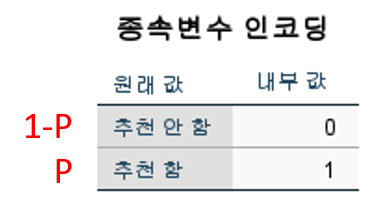 ❶ 이분형 종속변수의 코딩값이 자료분석을 위해 변환된 값(1=0, 2=1로 자동변환)
