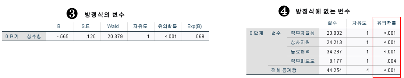 ❹ 로지스틱 회귀분석에 포함되지 않은 4개의 독립변수의 유의성으로 모든 변수가 유의함