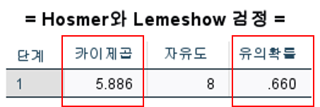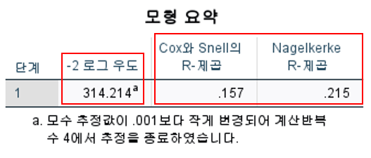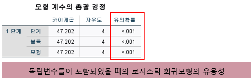 모형계수의 총괄검정 결과표에 카이제곱 유의확률을 보면, 독립변수가 투입되지 않았을 때와 비교해서 –2로그 우도가 유의한 수준으로 감소했는지를 의미하는 값이다.