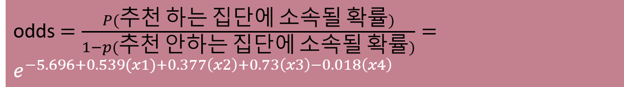 • EXP(B)는 e B 를 의미하는 것으로 odds를 나타내고, odds는 0인 집단(추천 안함)에 속할 확률 대비 1인 집단(추천함)에 속할 확률의 비율을 나타냄