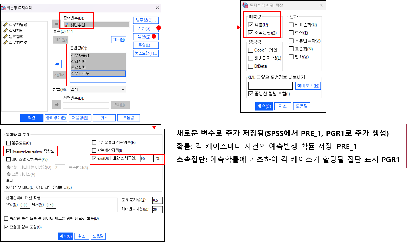 케이스 1번은 응답 분류 자체부터 추천하는 집단 1로 되어있다. 식에 대입해서 보면 추천하는 집단에 소속될 확률은 약 82.4%이고, 기준값 0.5보다 크므로 추천할 집단에 소속될 것으로 예측된다. 원래 취업추천으로 응답이 되었다하더라도 오즈비의 식을 통해 다른 집단에 분류될 수도 있다. 그러나 많은 케이스를 그것도 손으로 일일이 계산할 수 없다. 그래서 분석 설정할 때 예측값 중 확률과 소속집단을 새로운 변수로 저장하도록 지정한 것이다. 새로운 변수가 생성되는데 Pre1은 추천는 집단에 분류될 예측확률이고, PGR1은 예측 집단을 의미한다. 계산식과 SPSS에서 나타난 값이 다른 것은 소수점 자리수에 따른 반올림이 반영되었기 때문에 달라지는데 큰 차이가 없다.