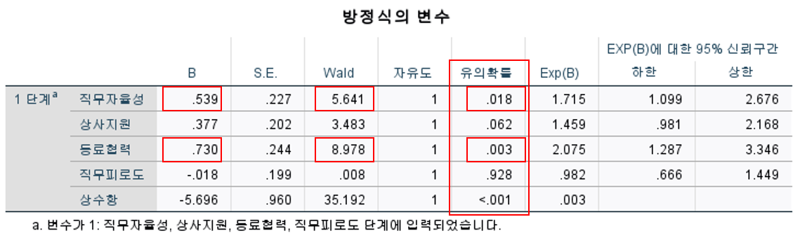 • 분류집단 예측력을 검증하기 위해 계수의 유의성 확인, 분석에서 직무자율성과 동료협력이 (+)으로 유의함