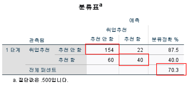 • 회귀계수(B)가 양(+)이면 해당 변수값이 클수록 1인 집단(취업 추천함)에 분류되고, 음(-)이면 변수값이 클수록 0인 집단(취업 추천안함)에 분류됨