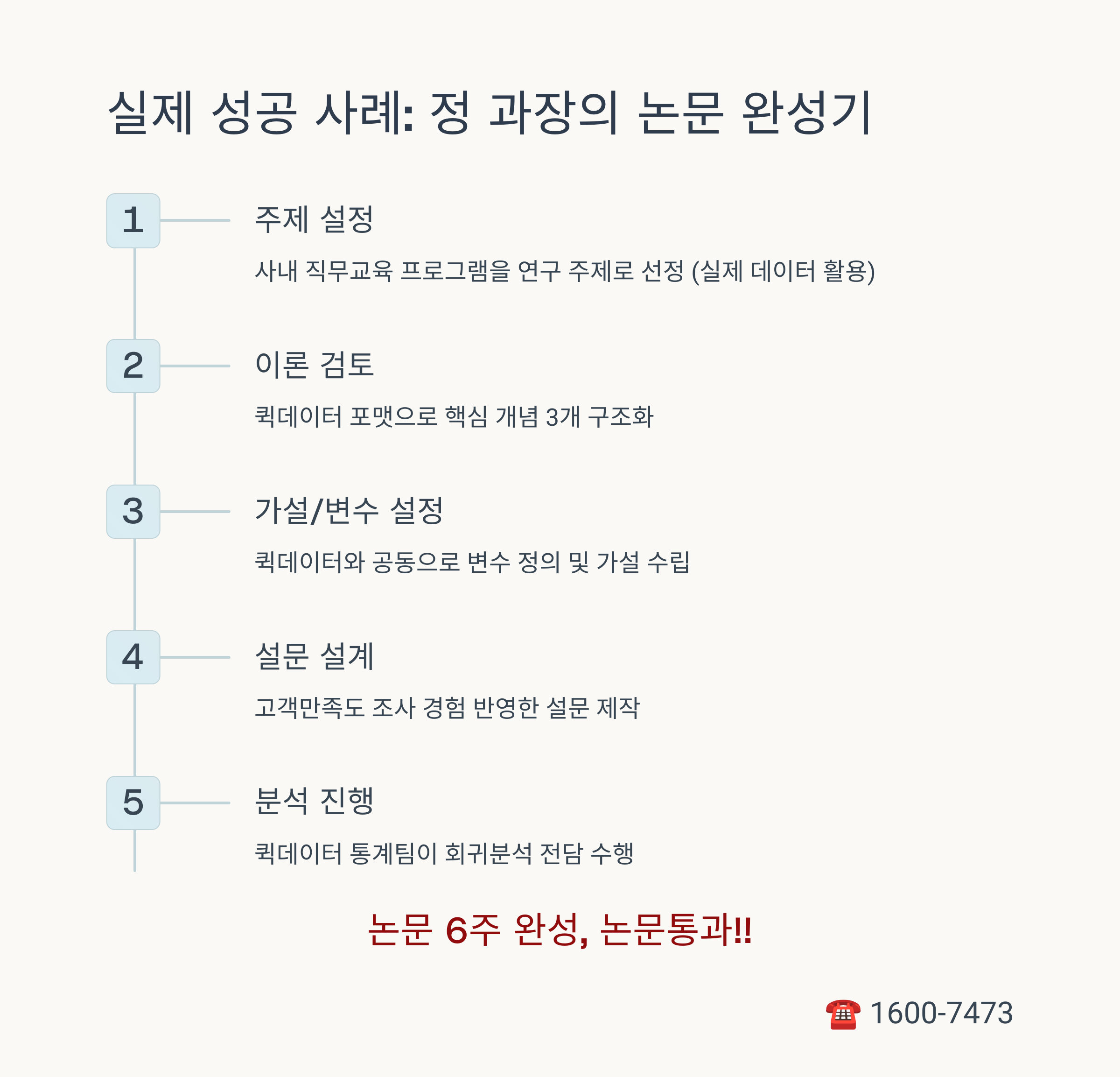 중견기업 교육팀의 정 과장은 바쁜 업무 때문에 논문 작성을 계속 미루다가, 어느새 학위 제출 기한이 코앞으로 다가왔습니다. 하지만 정 과장님은 '퀵데이터'와 함께 논문을 성공적적으로 완성하였습니다.