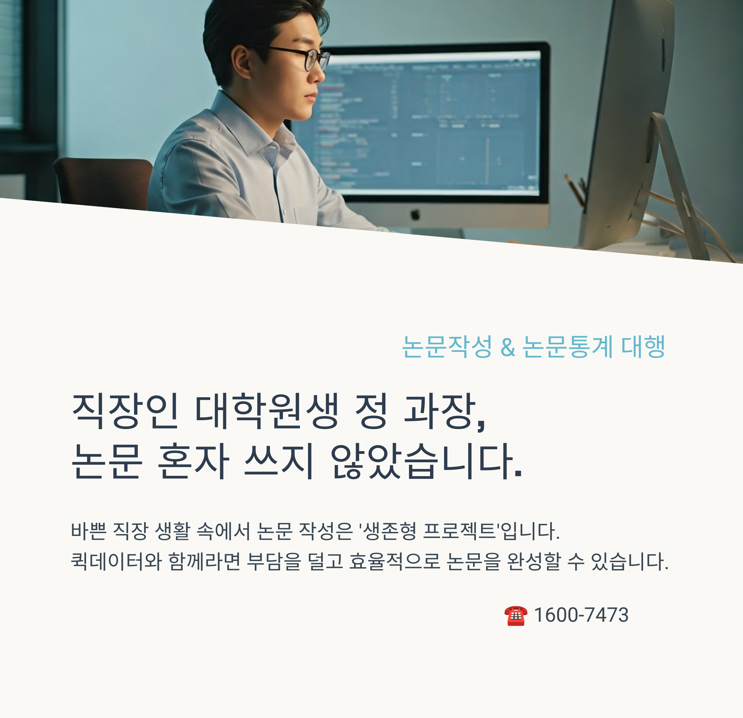 | 직장인 석사 논문, 통과 전략이 필요합니다 – 논문작성·통계분석대행 전문 지원 서비스 (0) | 2025.05.27 |
