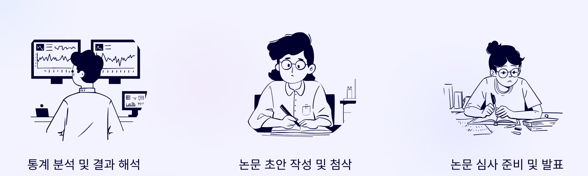 "논문을 써야 하는데 정말 아무것도 모르겠어요..." 대학원에 처음 입학한 분들이 가장 많이 하는 말입니다. 연구계획서부터 IRB 심사, 통계분석, 논문심사까지 복잡한 과정들이 막막하게 느껴지는 것은 당연합니다.
