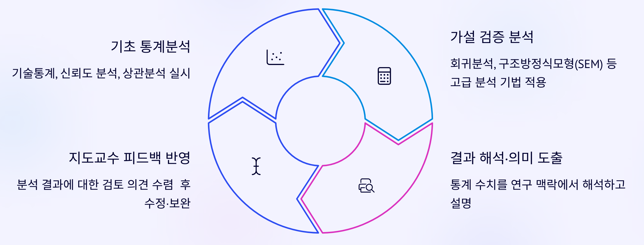 - 결과 해석 및 의미 도출 : 통계 수치를 연구 맥락에서 해석하고 설명