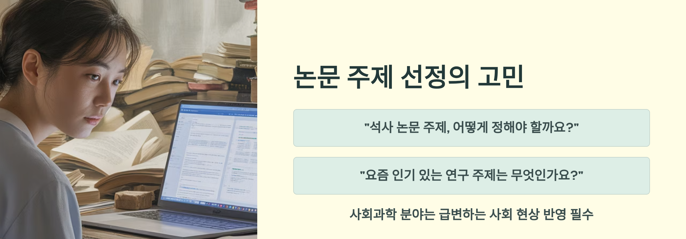논문 작성의 첫 관문이자 가장 큰 고민, 바로 논문 주제 선정입니다. 어떤 주제를 골라야 할지 막막한 것도 문제지만, 어렵게 주제를 정해도 '과연 의미 있는 연구가 될까?'라는 불안감에 휩싸이기 쉽습니다. 특히 사회과학 분야는 급변하는 사회 현상을 반영해야 하기에 최신 트렌드를 파악하는 것이 더욱 중요합니다.