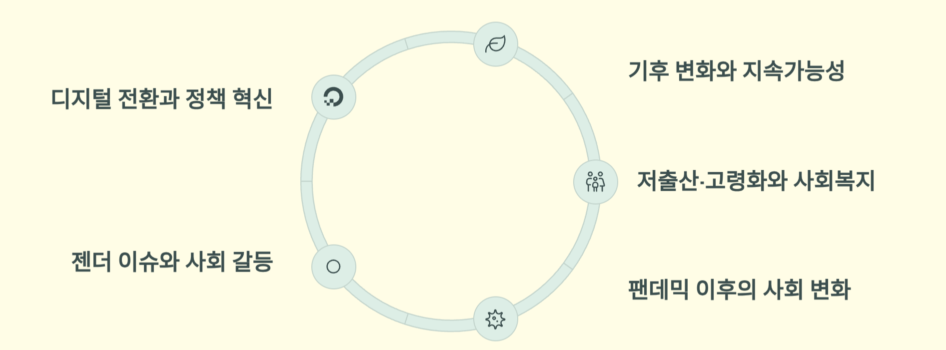 관심 있는 분야와 최신 트렌드를 결합해 보세요. '디지털 행정' + '시민 참여' → '디지털 시민 참여 플랫폼이 정책 결정 과정에 미치는 영향'과 같이 키워드를 조합하면 새로운 아이디어를 얻을 수 있습니다.