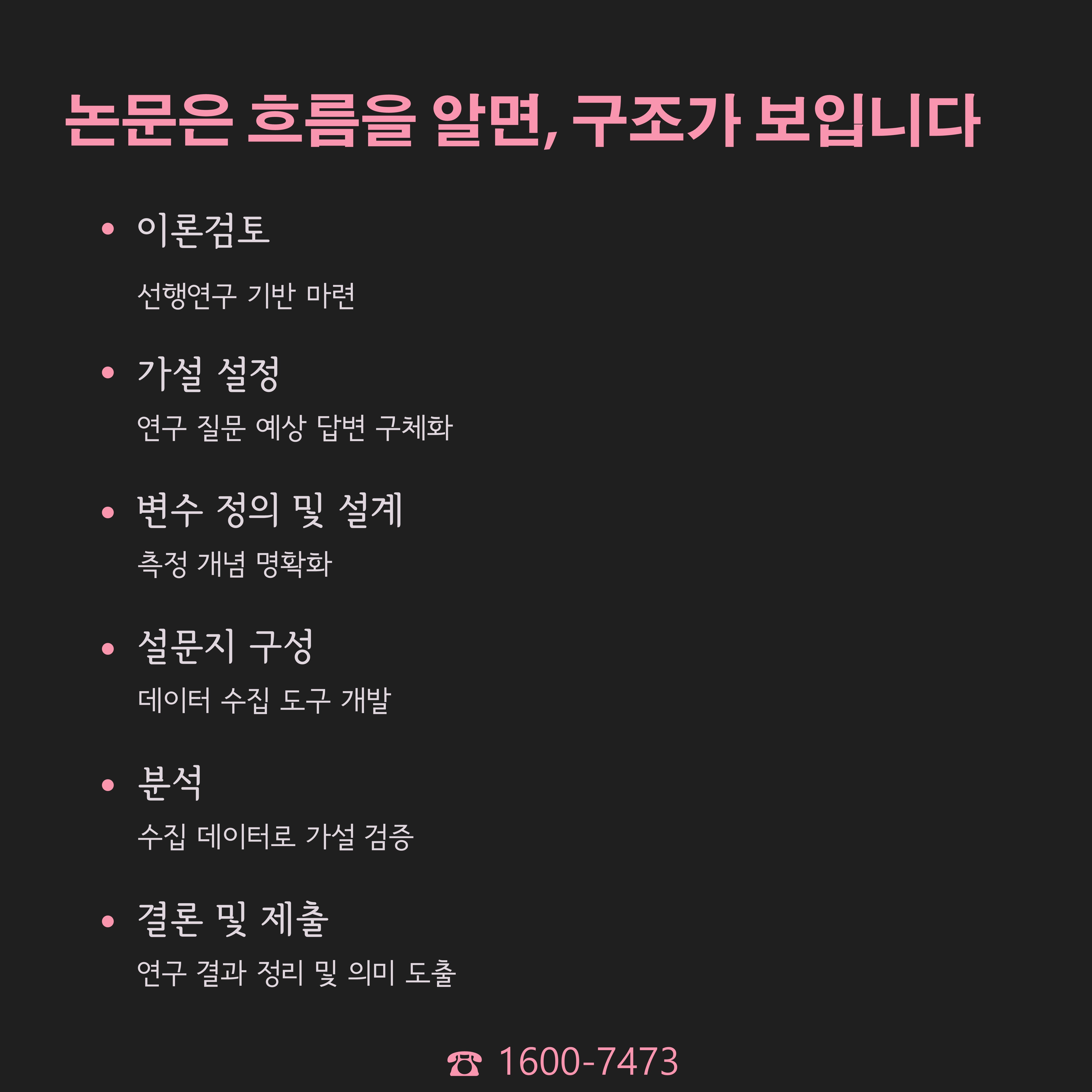 논문주제 선정 → 이론 검토(선행연구 분석) → 연구문제/가설 설정