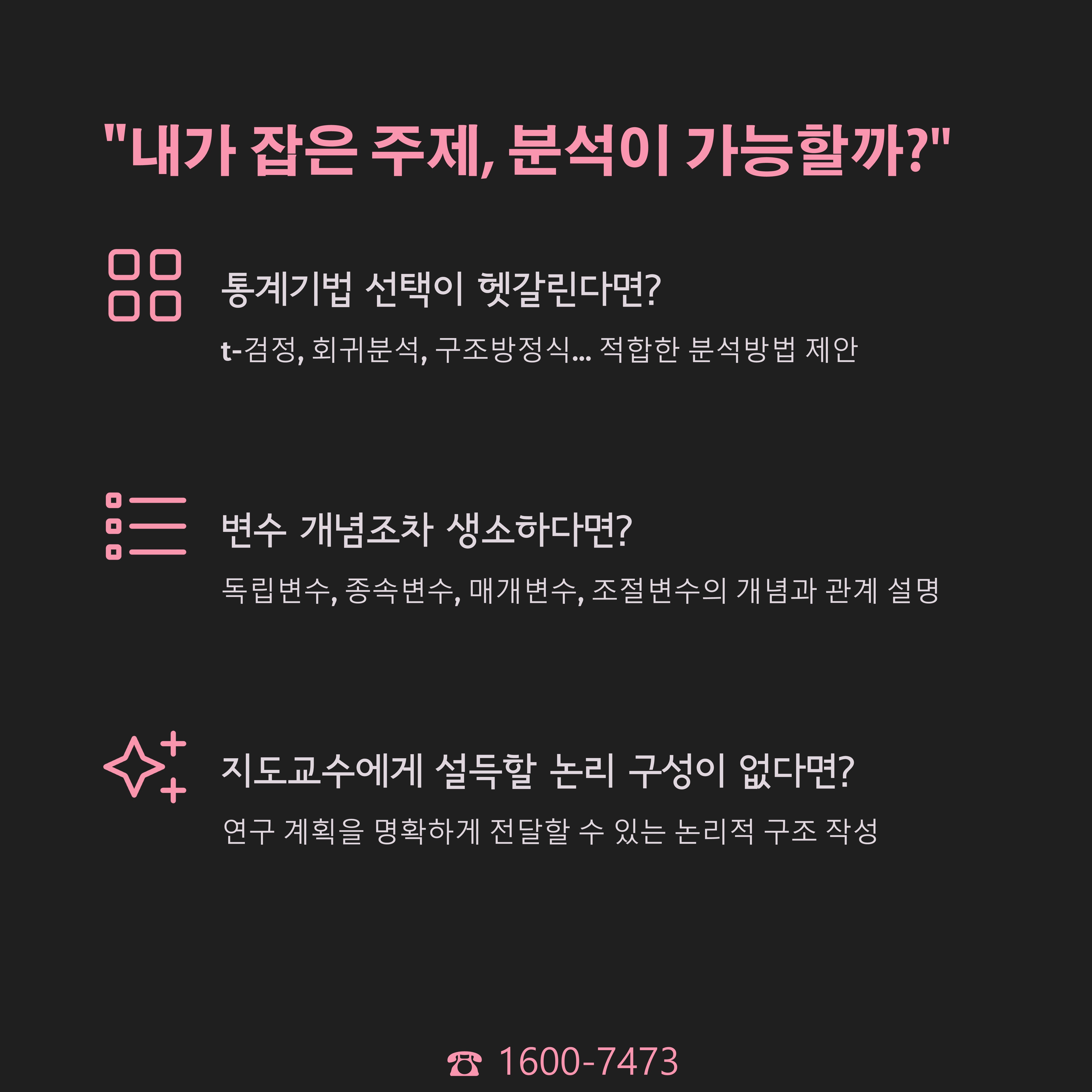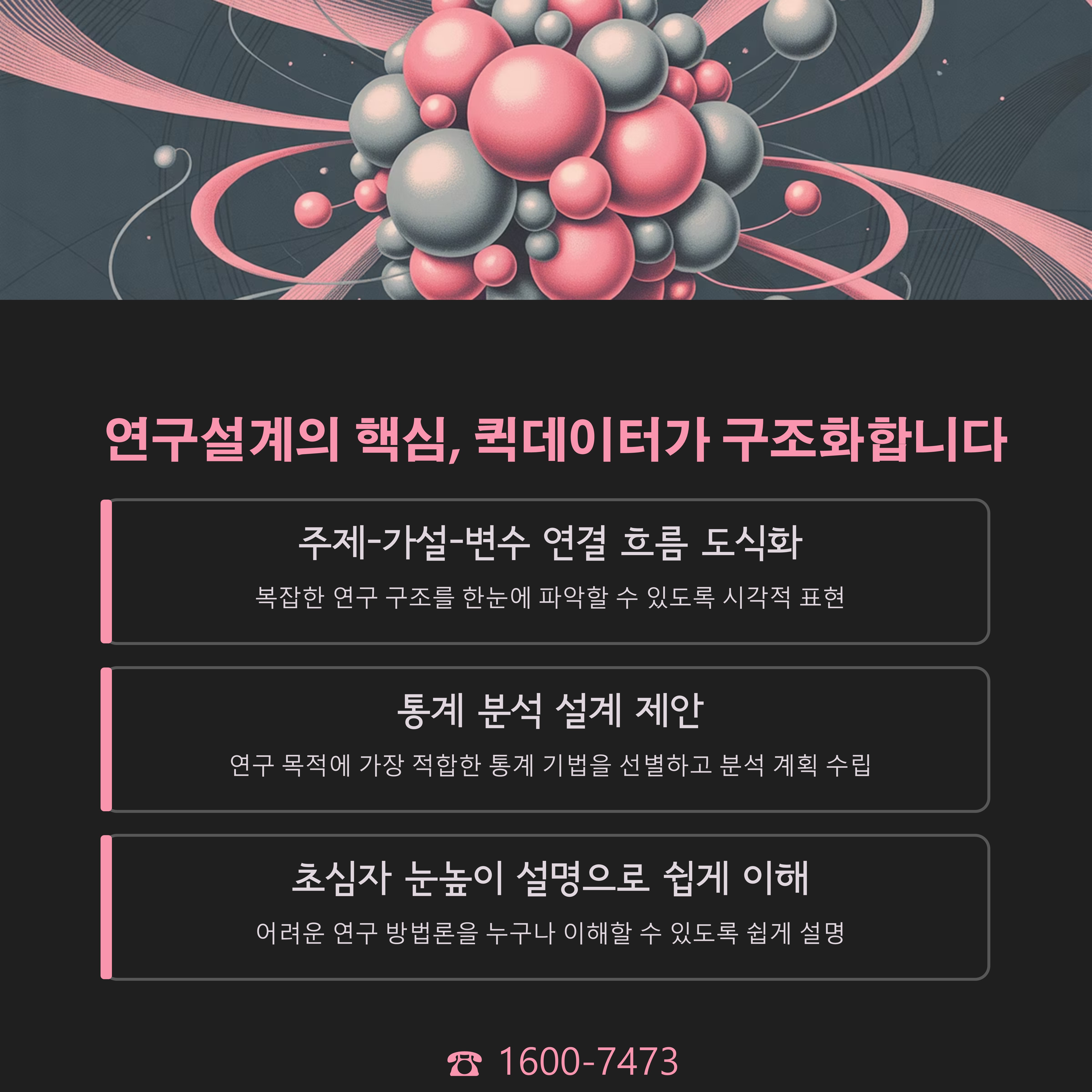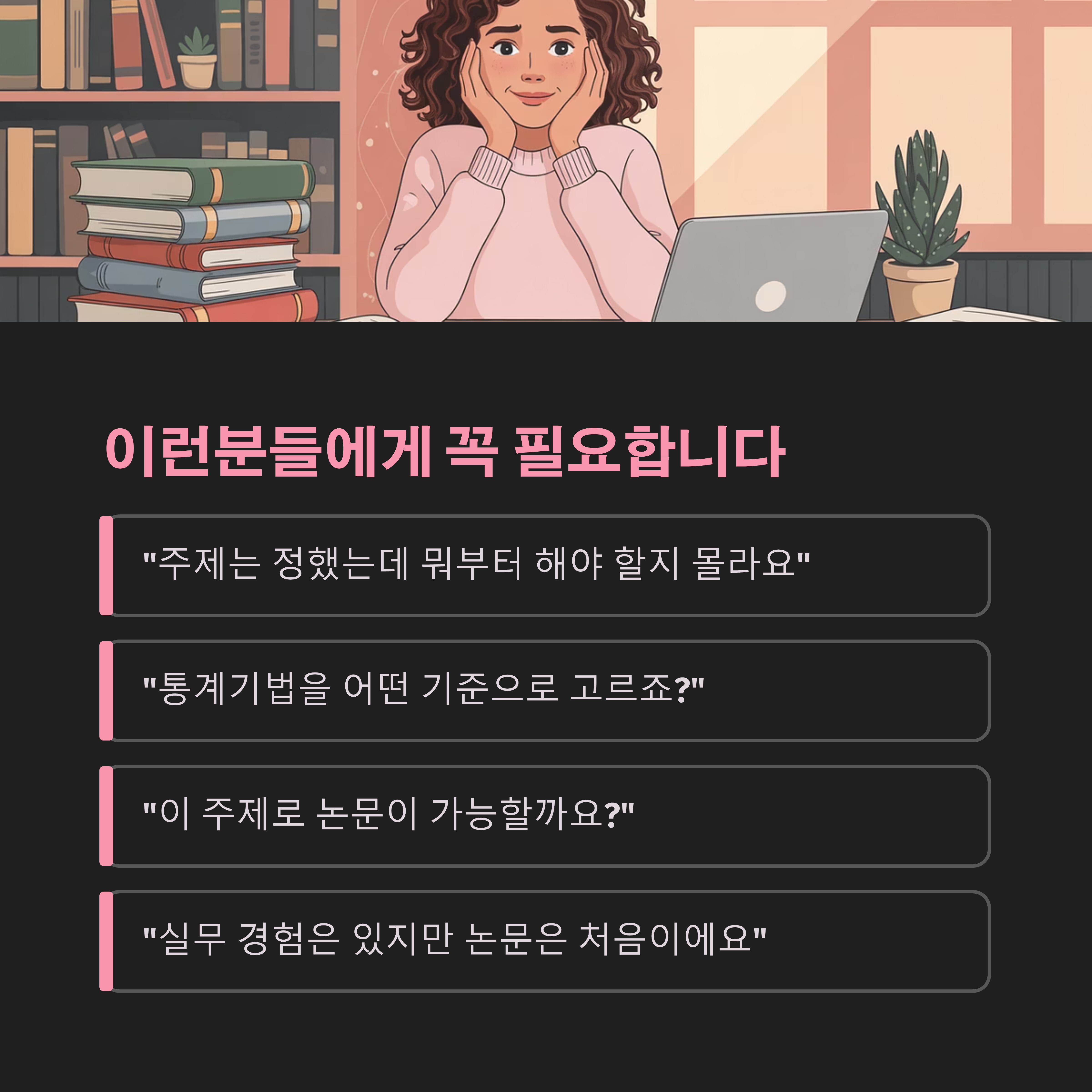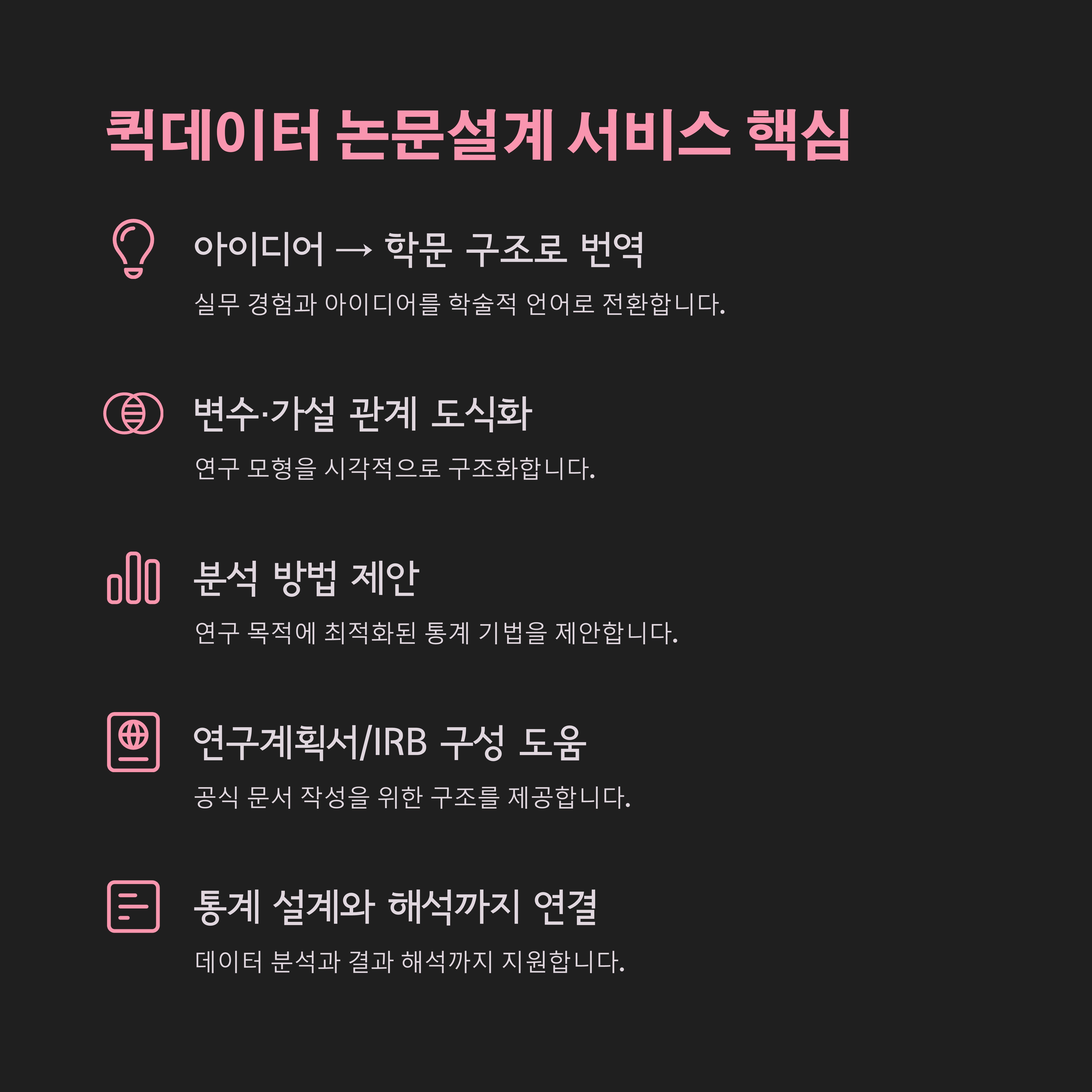 퀵데이터는 논문 초심자, 특히 실무 경험은 풍부하지만 학술적 논리 구조가 낯선 직장인 논문 대학원생들을 위해 체계적인 연구 설계 컨설팅을 제공합니다.