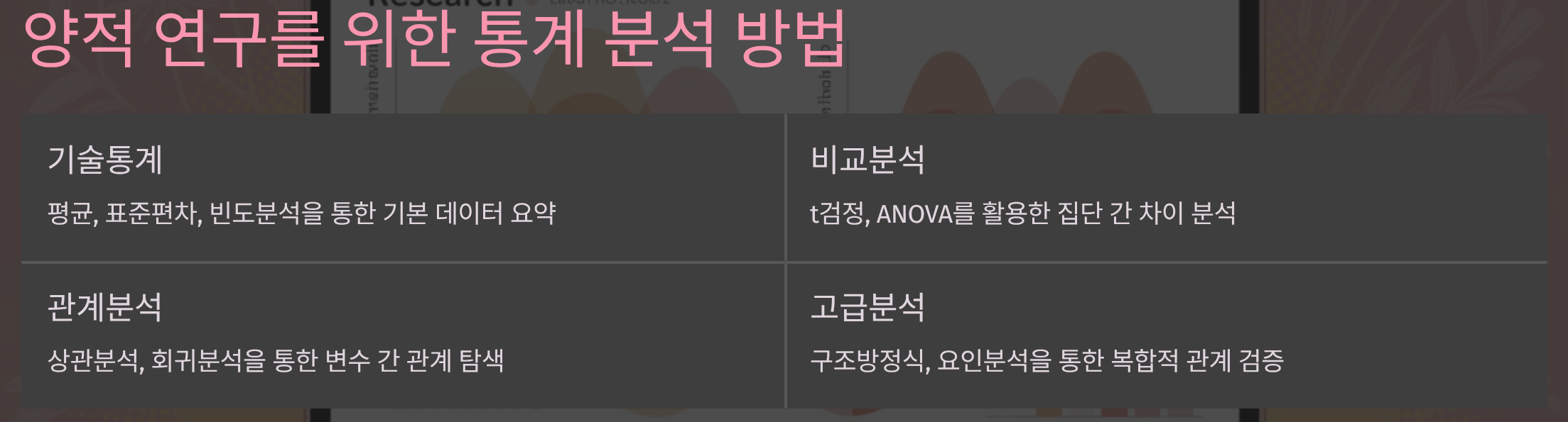 - 설문 및 통계분석을 통한 결과를 일반화하는 복합적 접근