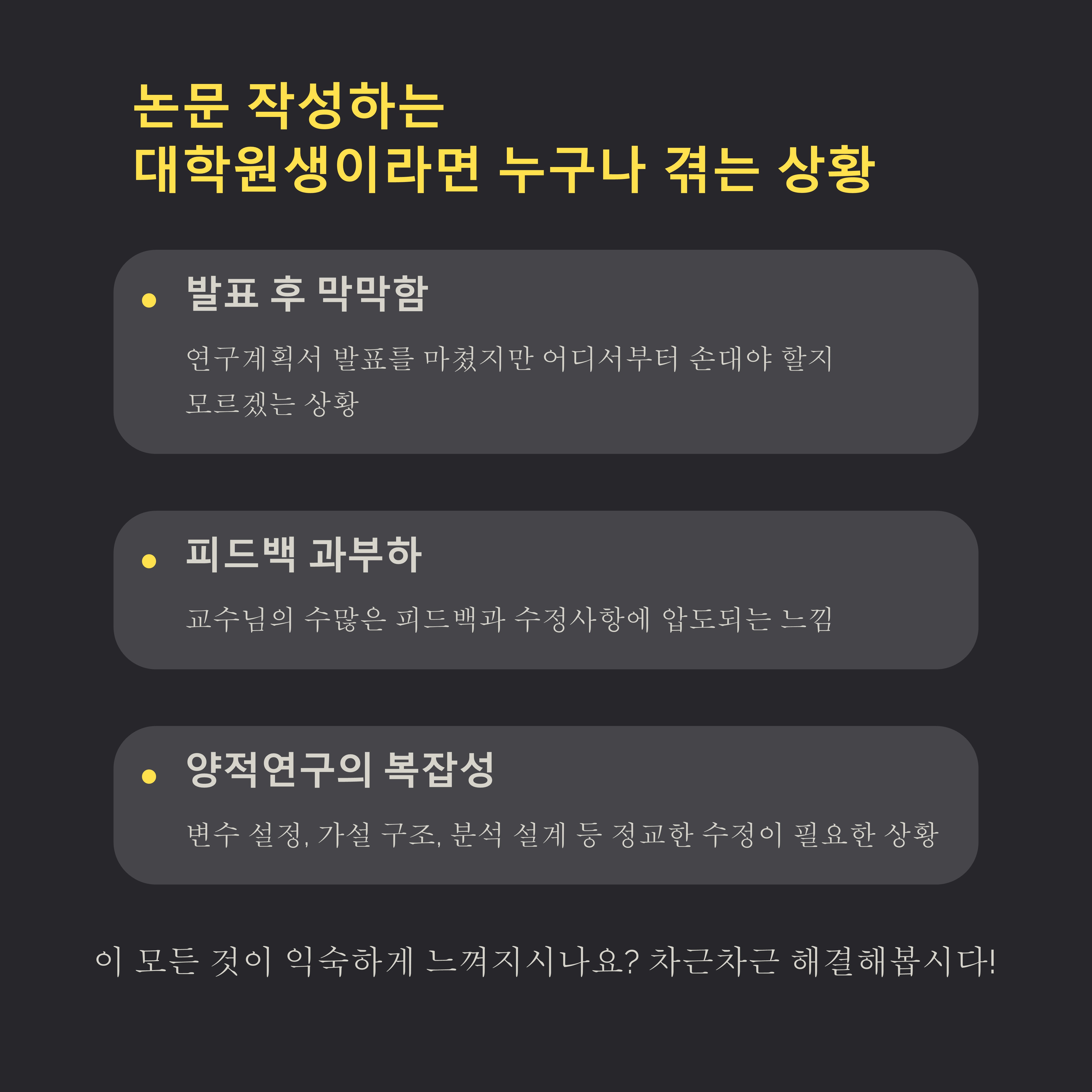 연구계획서 발표를 마친 후, 대부분의 대학원생이 공통적으로 겪는 상황입니다. 교수님의 컨펌은 받았지만, 남은 건 수많은 피드백과 ‘이제부터가 진짜 시작’이라는 부담감이죠. 특히 양적연구를 기반으로 한 논문은 변수 설정, 가설 구조, 분석 설계 등 손봐야 할 부분이 많아 더 막막하게 느껴집니다.