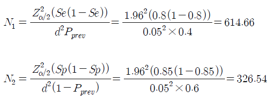 eg. 추정에 기초한 단일군 시험을 고려할 경우를 후향적 시험으로 예상되는 성능으로 민감도 및 특이도를 각각 80%(Se), 85%(Sp)를 예상하고, 양측 95% 신뢰수준(α/2)과 한쪽의 신뢰구간의 폭(d)은 각각 5%(전체 신뢰구간 폭은 10%가 되는 경우)로 설정할 경우 필요한 검체수는 얼마일까요?