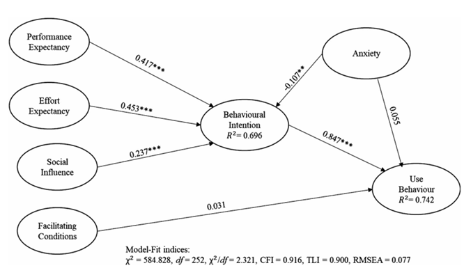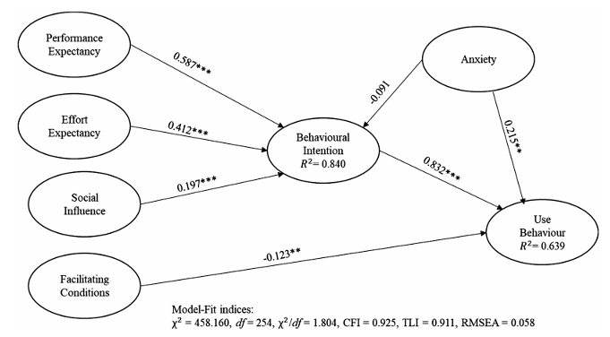 - UTAUT 모형 변수에 특화된 설문 설계, 신뢰도·타당도 검정, 구조방정식모형 분석