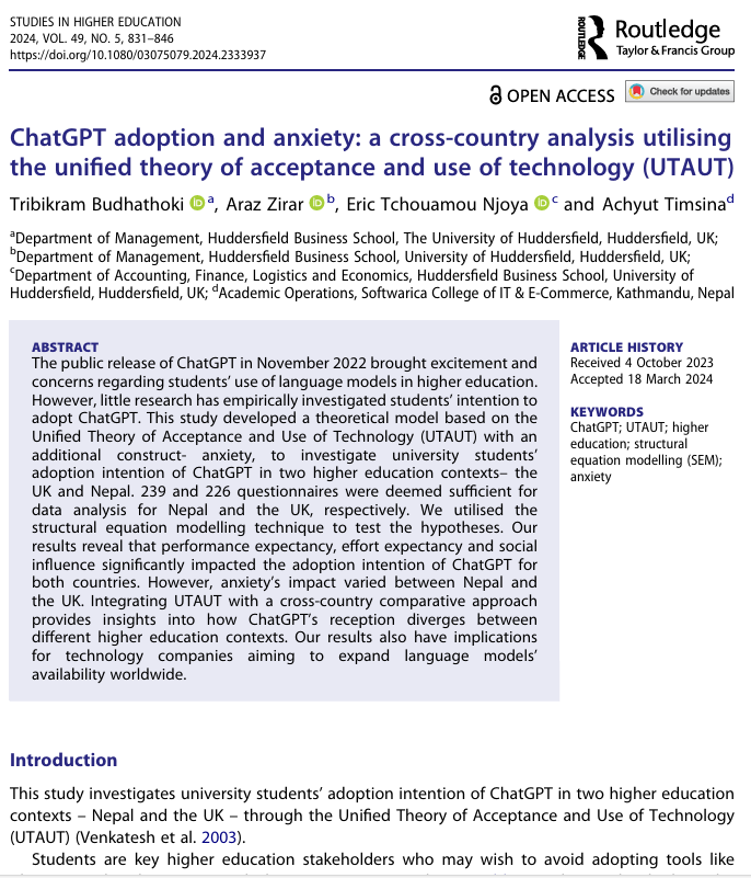 챗GPT(ChatGPT)의 채택과 사용에 대한 대학생들의 의도와 실제 행동을 영국과 네팔 두 국가 간의 비교를 통해 조사한 연구 논문입니다. 연구는 통합기술수용이론(UTAUT)에 불안감(anxiety)이라는 추가 요소를 통합하여 진행되었습니다.