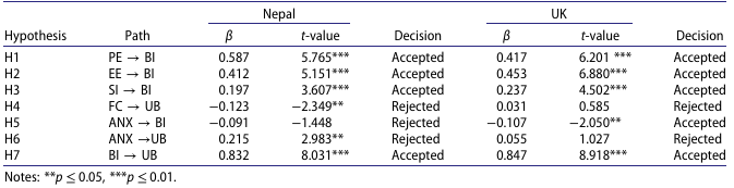 - 선행 연구에서 차용하였으며 네팔과 영국 맥락에서 ChatGPT 채택에 맞게 수정