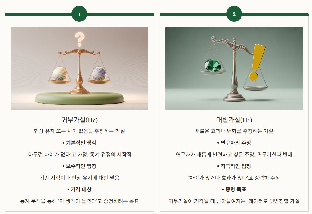 통계적 가설 검정은 귀무가설(H₀)과 대립가설(H₁)이라는 두 가지 상반된 가설을 중심으로 전개됩니다. 이 둘은 동전의 양면처럼 항상 함께 존재하며, 서로 반대되는 내용을 담고 있습니다.