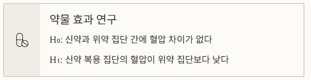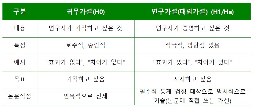 - 기본 전제: 연구자의 주장이 입증되기 전까지는 참(true)으로 간주