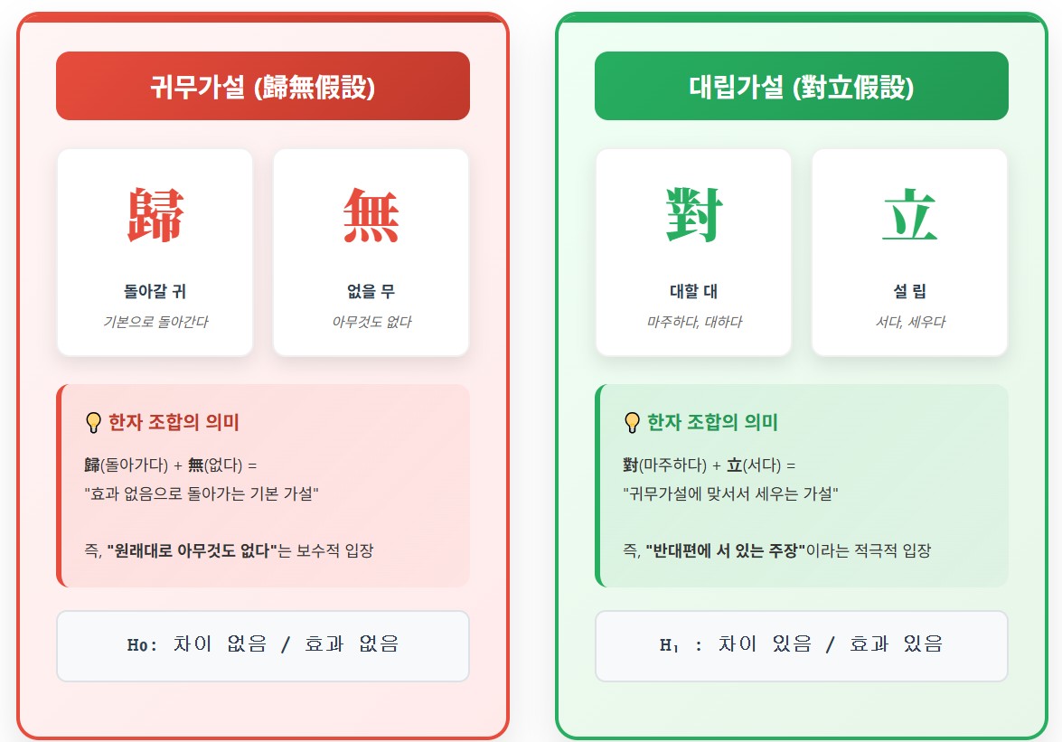 한자의 의미를 보면 두 가설의 관계가 명확해집니다. 귀무가설은 '원래 상태'를 나타내고, 대립가설은 그에 '맞서는' 새로운 주장을 의미합니다.