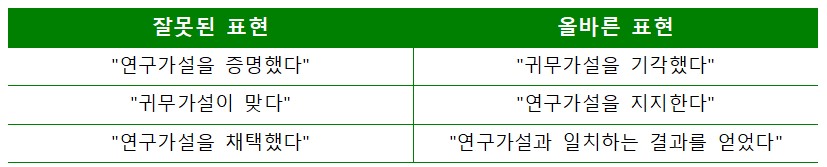 - 보수적 입장: "효과가 없다", "차이가 없다", "관계가 없다"