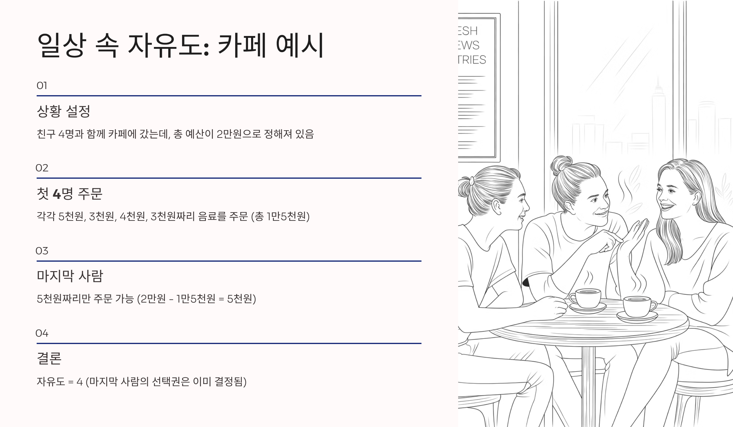 이렇게 평균이 고정돼 있기 때문에, 마지막 값은 “자유롭게” 변할 수 없고 이미 결정되는 겁니다.