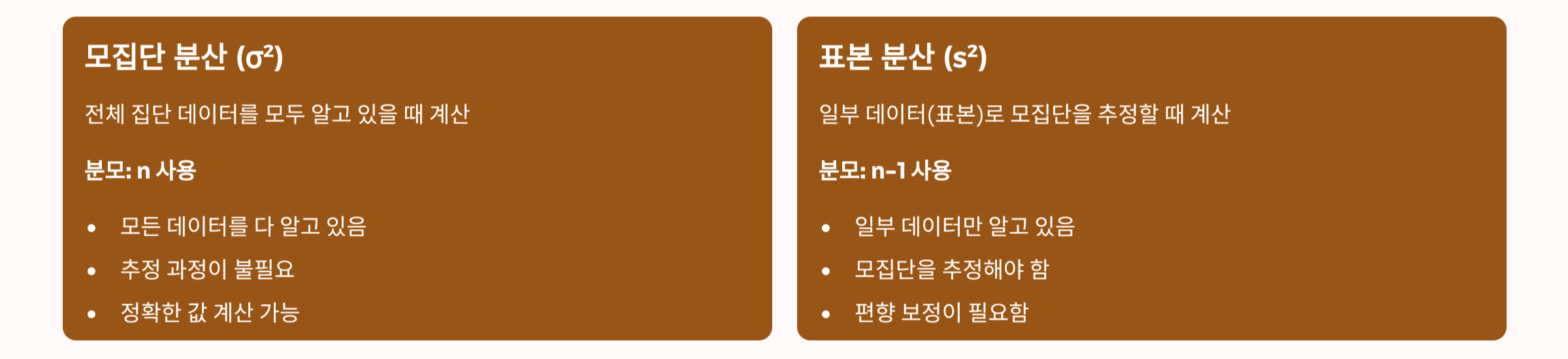 - 표본 분산(s²): 일부 데이터(표본)로 모집단을 추정할 때 계산 → 분모 n-1사용