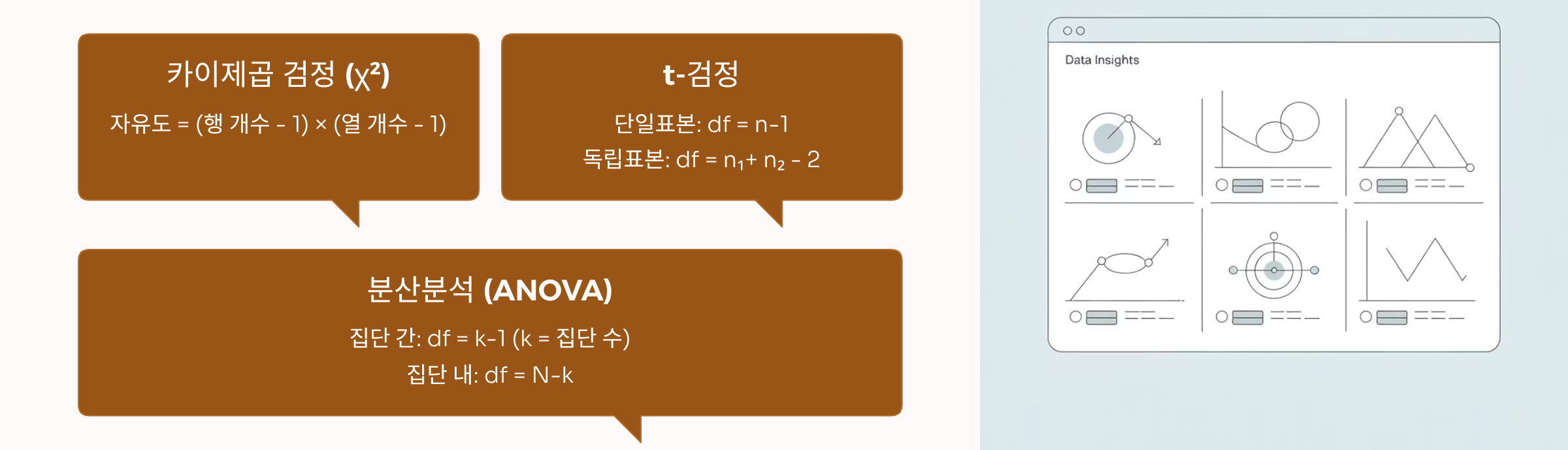 회귀분석: df = n - k - 1 (k는 독립변수 개수), 독립변수가 많아질수록 자유도 감소, 과적합(overfitting) 위험 증가