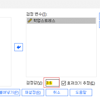 분석 → 평균 비교 → 일표본 T 검정 → 검정 변수: 학업스트레스 → 검정값: 3.5 → 옵션(신뢰구간 95%, 결측값 목록별 제외) → 확인