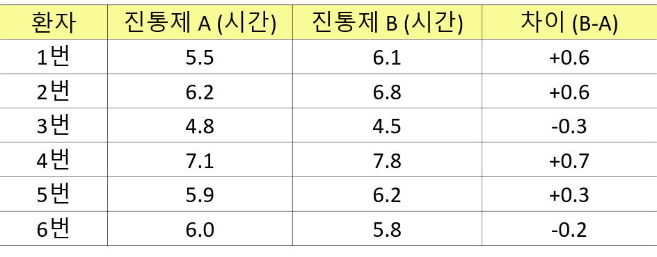 - 결론: 두 진통제 간 유의미한 차이를 발견하지 못함