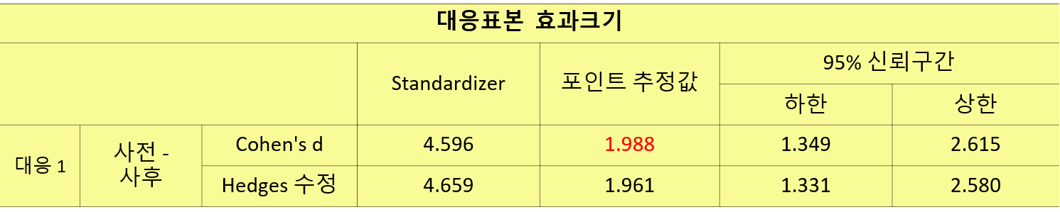 대응표본 t검정은 하나의 집단에서 사전·사후 변화를 검증할 때 사용하는 핵심 분석입니다. 프로그램 참여 전후, 교육 효과, 치료 전후 변화 등 연구 현장에서 가장 자주 활용되며, 논문에서는 단순한 차이검증을 넘어 효과크기와 신뢰구간까지 함께 제시해야 완성도 높은 결과가 됩니다.