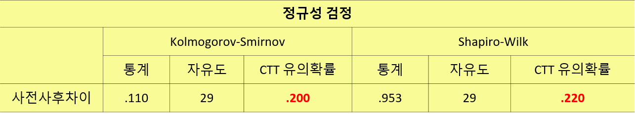 ※ 분석 결과에 따라 사전 사후 차이는 정규분포 가정을 만족하므로 대응표본 t검정 가능