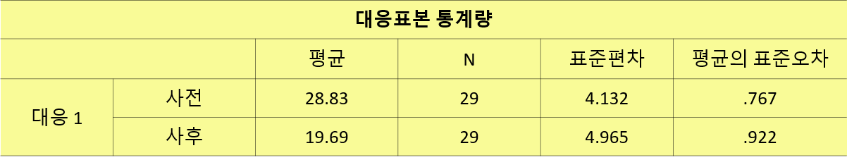 여기서 중요한 점은 '29명의 A그룹 vs 다른 29명의 B그룹'을 비교하는 게 아니라는 겁니다. 29명 전체가 어떻게 변했는지를 봅니다.