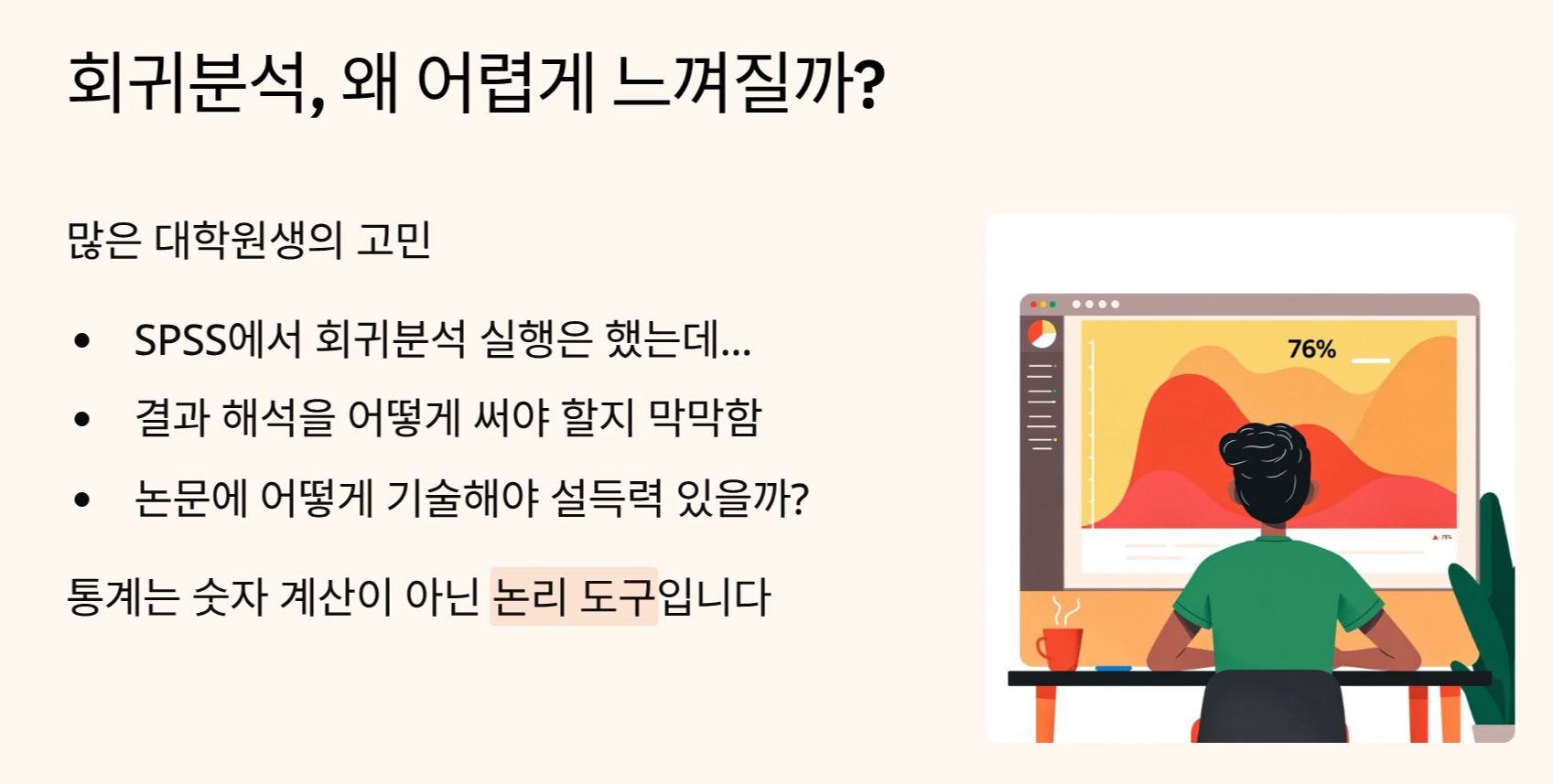 하지만 많은 대학원생이 “SPSS에서 회귀를 돌렸는데 해석을 어떻게 써야 할지 모르겠다”는 고민을 합니다.