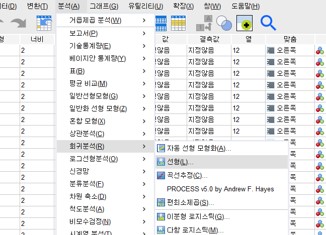 1. 상단 메뉴 → [분석] → [회귀분석] → [선형]