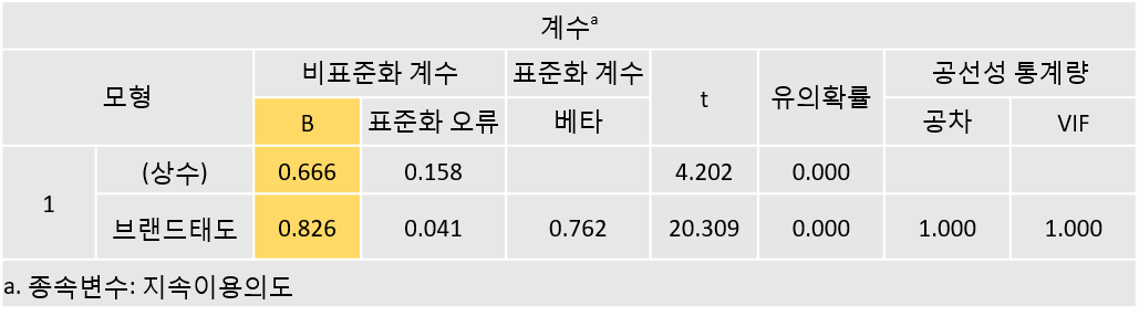 즉, 브랜드태도가 높아질수록 지속이용의도가 0.826점 증가하였다.”