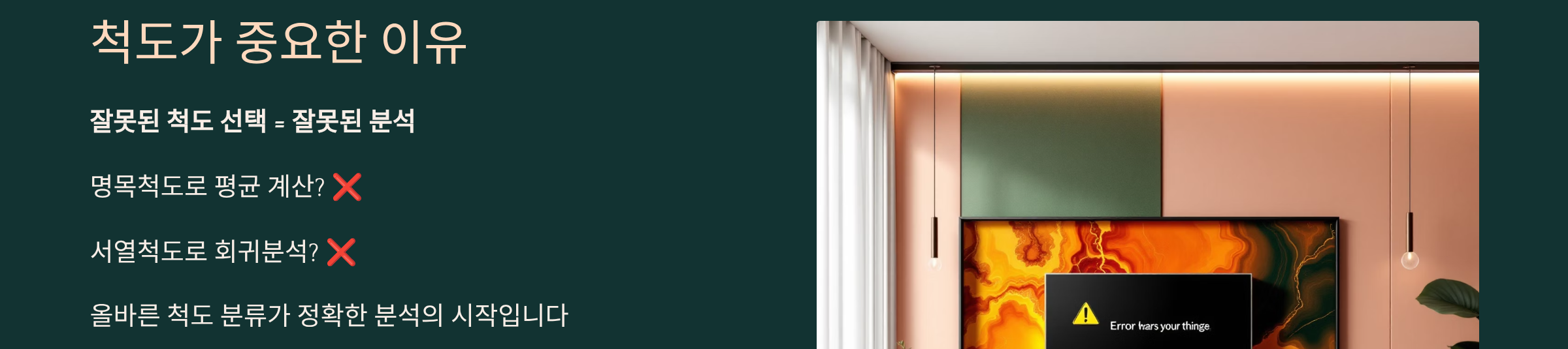 척도를 잘못 분류하면 분석 방법 자체가 틀려집니다. 예를 들어 명목척도 변수로 평균을 내거나 t검정을 하면 연구결과가 왜곡될 수 있습니다.