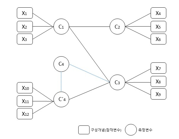 위 그림처럼 각가의 서로 다른 구성개념을 나타내는 잠재변수 C1과 C2 사이의 단선은 잠재변수들 간의 이론적 연관성이나 관계를 나타냅니다. 잠재변수들 간에 단선으로 표시된 것은 변수들 간의 관계가 기존 연구에서 입증됨으로써 그 관계가 이미 검증되었음을 의미합니다. 반면 잠재변수 C3와 C4 간의 관계를 나타내는 점선은 아직 구체적으로 입증되지 않은 상태의 관계를 나타내죠.