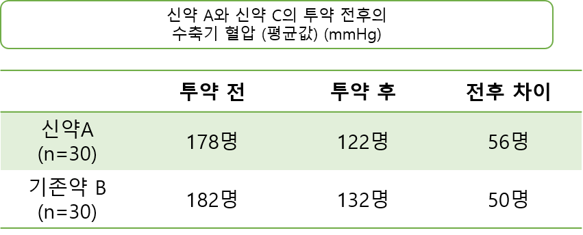 연구결과 : 혈중 콜레스테롤 수치는 신약 A를 투여한 그룹에서 평균 60mg/dl이, 기존약 B를 투여한 그룹에서는 평균 25mg/dl 저하시켰다. 신약 A를 투여한 그룹은 기존약 B를 투여한 그룹에 비해 혈중 콜레스테롤 수치가 유의하게 크게 저하되었다(P<.001).