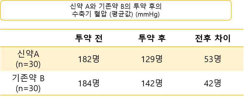 이것으로부터 “신약 A는 기존약 B에 비교해서 유의하게 큰 폭으로 혈압을 강하시켰다” 라고 판단할 수 있습니다.