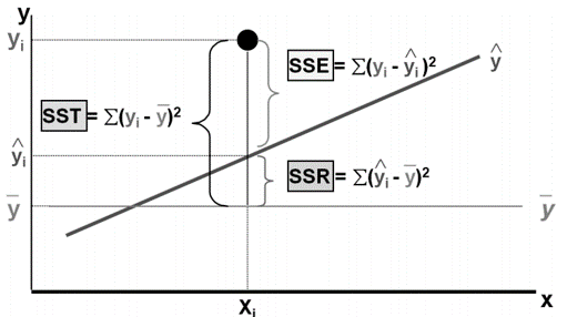 제곱합은 3가지가 있는데 합계의 제곱합(SST)은 종속변수를 평균값으로 추정하는 경우의 전체분산입니다. 회귀모형의 제곱합(SSR)은 종속변수를 회귀식으로 추정하는 경우에 설명되는 분산을 말하고, 잔차의 제곱합(SSE)은 종속변수를 회귀식으로 추정하는 경우 설명되지 않는 분산을 말해요.