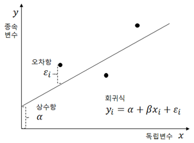 아래 그림과 같이 y를 종속변수, x를 독립변수라고 할 때 α는 선형식의 절편(상수항)이라고 할 수 있는데 변하지 않습니다. β는 회귀계수라고 하고 보통 1차식에서는 기울기(변화량)라고 표현합니다. ε는 독립변수 x가 종속변수 y를 설명하지 못하는 나머지를 말하는데 오차 혹은 잔차라고 합니다. i는 회귀분석을 위한 케이스입니다.