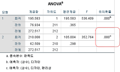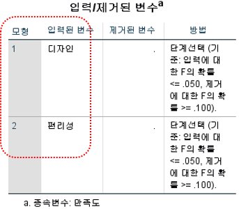 이제 위 예로 다중회귀분석의 단계선택 방식으로 분석해보겠습니다. 아래 표와 같이 단계선택 방식에 의하면 1번 모형은 1개의 독립변수 디자인만 투입되었고, 2번 모형은 독립변수가 디자인과 함께 편리성이 투입되어 2개로 만든 모형이라는 것을 알 수 있습니다.