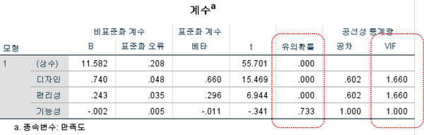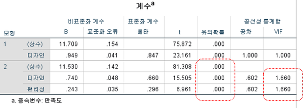 독립변수인 디자인과 편리성 모두 정(+)적으로 유의하게 나타났습니다. VIF(분산팽창지수)는 1.660으로 다중공선성이 없는 것으로 나타났습니다.