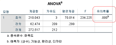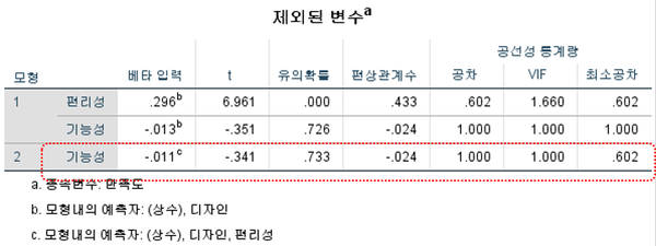 디자인, 편리성, 기능성 3개의 독립변수 중 기능성은 회귀모형에서 제외된 것을 알 수 있습니다.