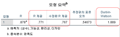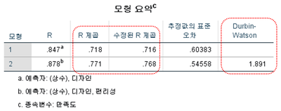 R 제곱은 1번 모형이 0.718, 2번 모형이 0.771로 나타나 2번 모형의 설명력이 1번 보다 높다는 것을 알 수 있습니다. 잔차의 독립성을 검토하는 Durbin-Watson의 통계량은 1.891로 2에 근사하므로 독립성을 충족하였습니다.