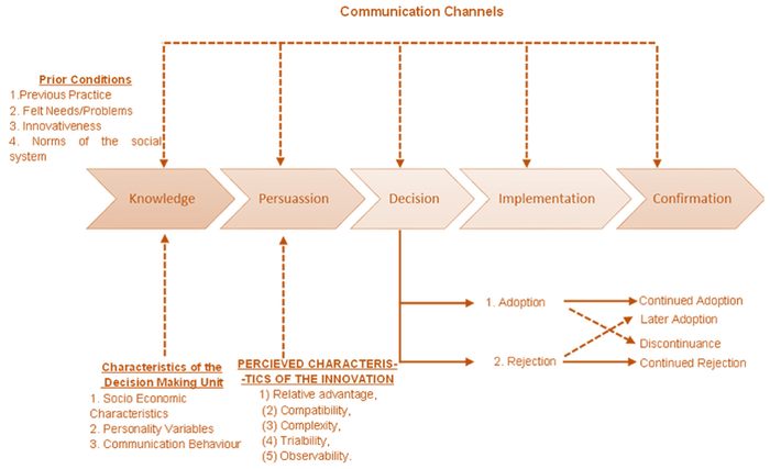 혁신확산의 요인들과 더불어 혁신의 결정과정은 지식, 설득, 결정, 실행, 확정의 5단계로 발생한다(Rogers, 2003).