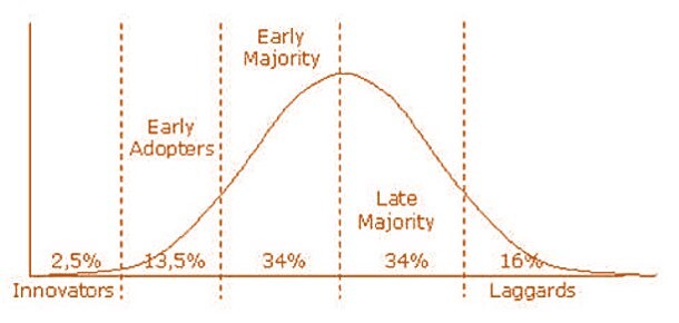 혁신 성향을 기준으로 사회 구성원들을 범주화해 혁신가(innovators), 초기 채택자(early adopters), 초기 대다수(earlymajority), 후기 대다수(late majority), 혁신 지체자(laggards)의 다섯 개 집단으로 구분하고 각 집단의 특성에 대한 설명을 제시했다.