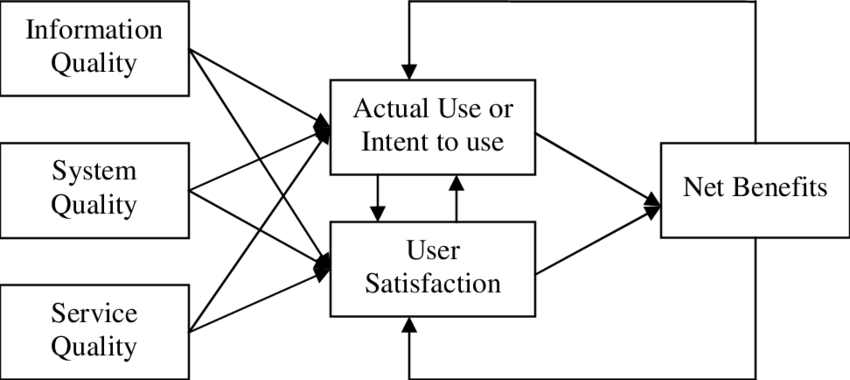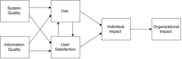 정보시스템성공모델은 시스템 품질 및 정보 품질이 사용과 사용자 만족에 영향을 주고, 사용과 사용자 만족은 상호 영향을 미치며, 이런 특성들이 개인적 영향에 영향을 미치고 최종적으로 조직적 영향까지 영향을 미친다는 개념적 틀로 분석된다.